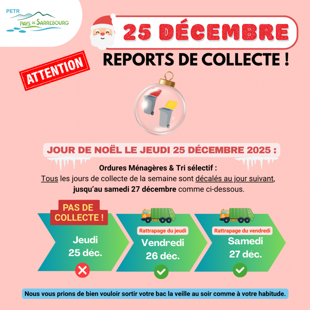 Planning NOËL : Jeudi 25 déc. = PAS DE COLLECTE > Vendredi 26 déc. = rattrapage du Jeudi > Samedi 27 déc. = rattrapage du Vendredi.