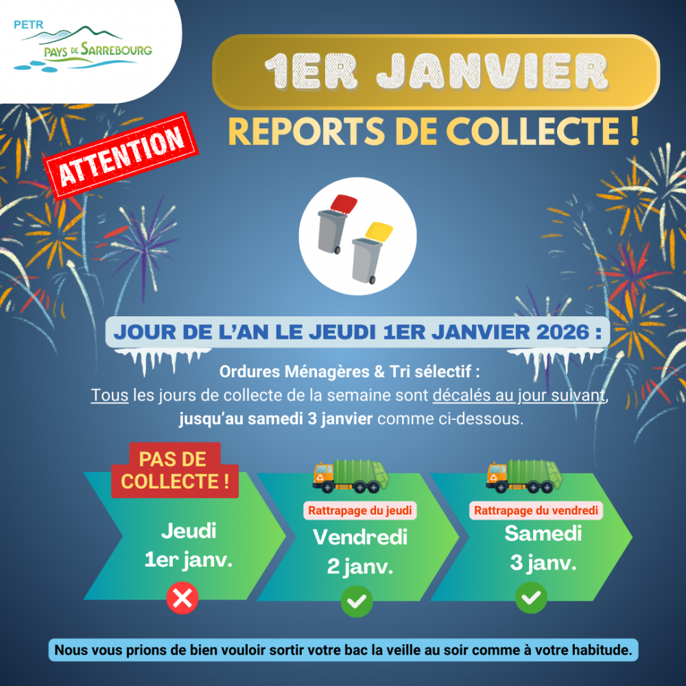 Planning NOUVEL AN : Jeudi 1er janvier 2026 = PAS DE COLLECTE > Vendredi 2 janv. = rattrapage du Jeudi > Samedi 3 janv. = rattrapage du Vendredi