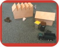 Circuit avec des maquettes en bois qui part du supermarché, passe par la maison, puis les petites poubelles, la bulle à verre, la déchèterie et le centre de tri pour terminer vers les centres de recyclage des emballages et le centre d’enfouissement des déchets ultimes (avec les différents camions de ramassage).